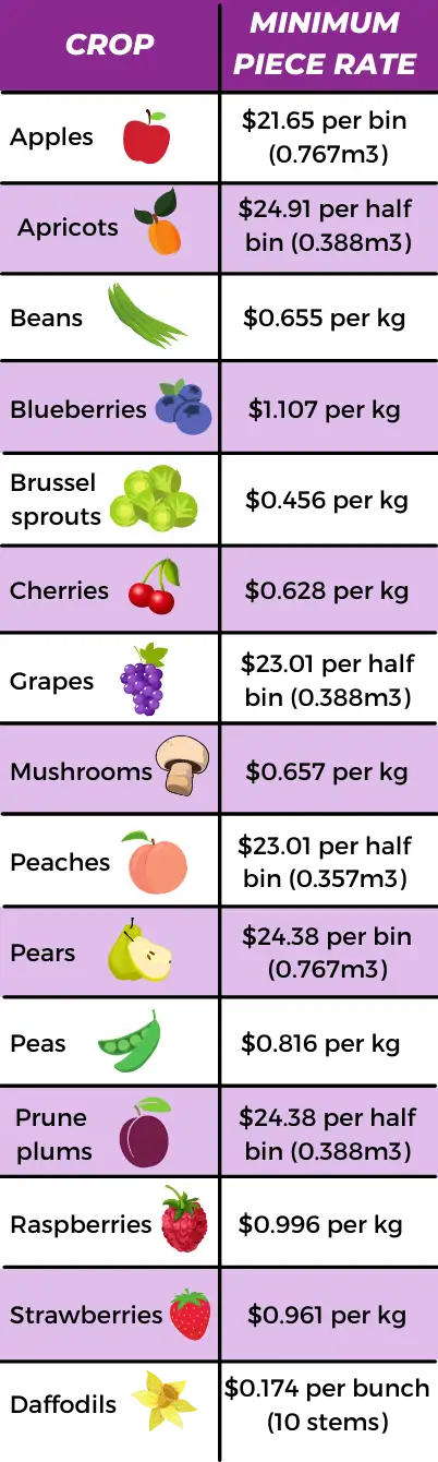 The law in BC includes a detailed description of who is considered a farm worker. Farm workers who pick crops by hand may be paid by piece rate — that is, by the amount picked.