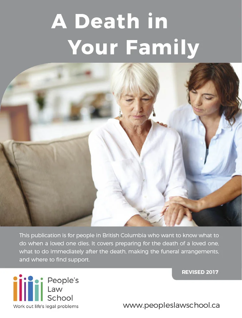 A Death in Your Family is for people in British Columbia who want to know what to do when a loved one dies. It covers preparing for the death of a loved one, what to do immediately after the death, making the funeral arrangements, and where to find support. The information is current to January 2017.